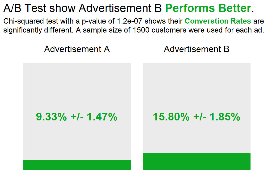 title = glue('A/B Test show Advertisement B <span style = "color:{colors[2]}">**Performs Better**</span>.')